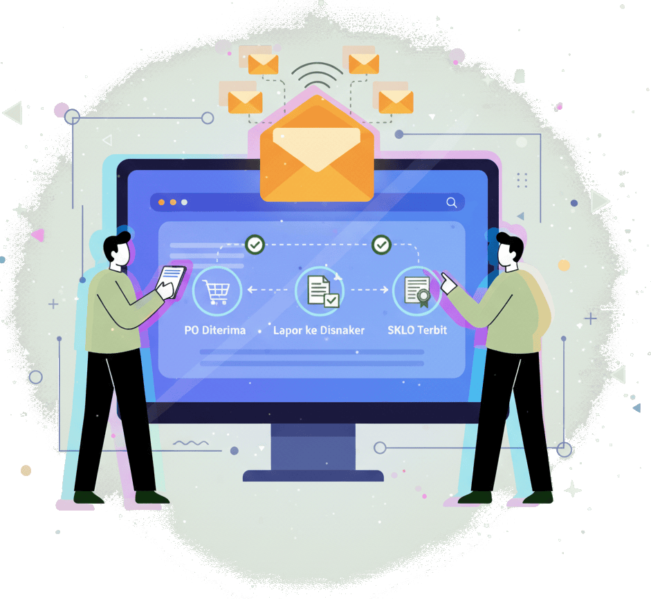 Notifikasi Otomatis di Setiap Tahap: Sistem kami secara otomatis mengirimkan email pemberitahuan saat status berubah—mulai dari PO diterima, laporan diserahkan ke Disnaker (lengkap dengan bukti tanda terima digital), hingga SKLO terbit.